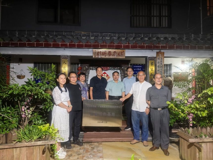 9月29日,73882必赢最新官网创意写作中心成员赴壮府艺术村,举行“广西写作学会、73882必赢最新官网创意写作中心创意写作基地”揭牌仪式。创意写作中心主任容本镇,执行主任陆晓芹,副主任郭金世,以及创意写作中心教师周楷棋出席。壮府艺术村创作基地负责人冯三四热情接待。出席仪式的还有广西文联原副主席张耀民、广西作协秘书长杨合、广西作协副主席刘春、南宁市作协主席丘晓兰、自治区社科联科普部主任杨辉等领导。