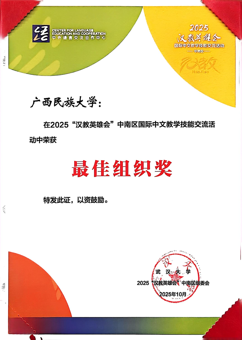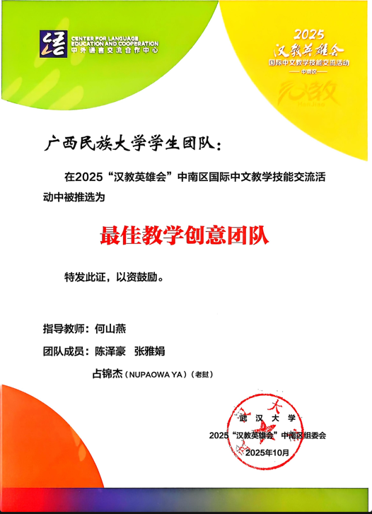 10月25日,由教育部中外语言交流合作中心、全国国际中文教育专业学位研究生教育指导委员会和全国高校汉语国际教育本科专业负责人联席会联合主办、武汉大学承办的2025年“汉教英雄会”中南片区国际中文教学技能交流活动在武汉成功举办。必赢官网国际中文教育硕士生团队凭借卓越表现,在激烈竞争中脱颖而出,荣获“最佳教学创意团队”和“最佳组织”两项大奖。