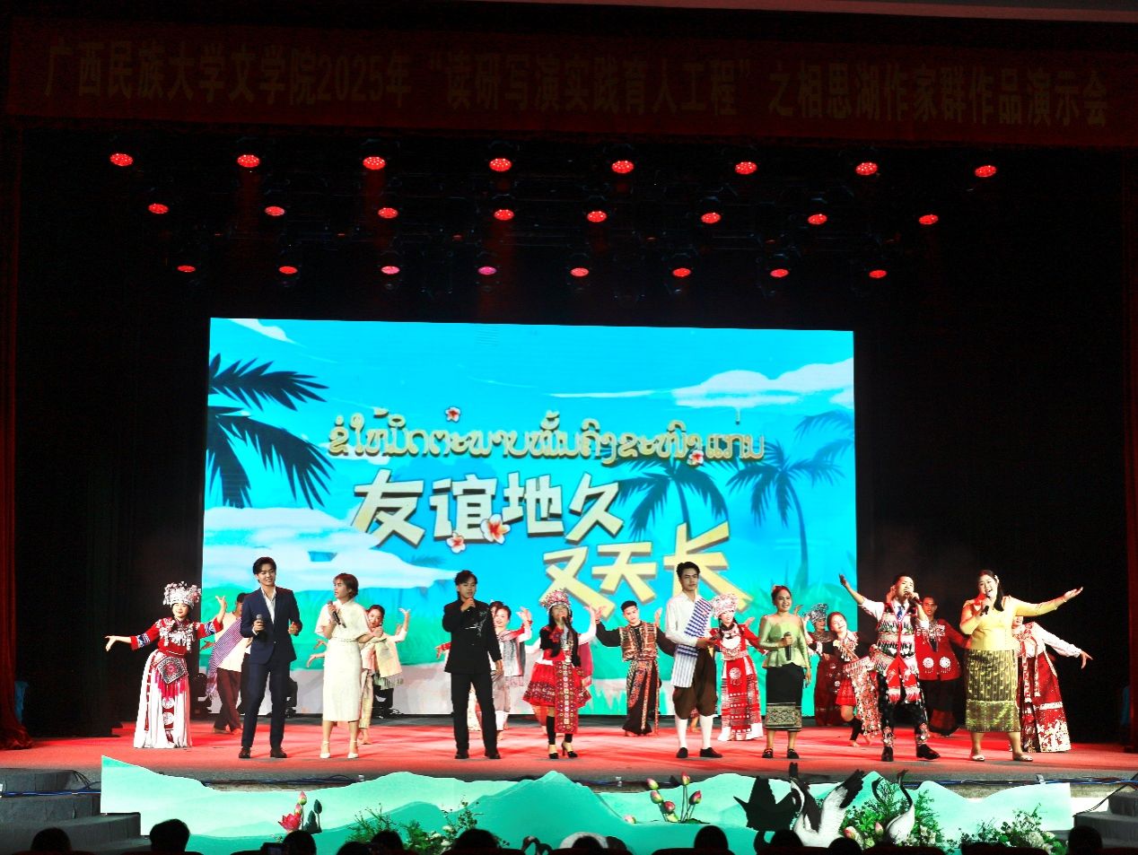 11月1日晚,73882必赢最新官网“读研写演实践育人工程”之相思湖作家群作品演示会如期在相思湖校区大礼堂成功举行。活动特邀73882必赢最新官网党委副书记、纪委书记韦雪芳,广西作协党组成员、秘书长杨合及全国各地参加国际中文教育研究方法学术研讨会的专家学者,我校各职能部门、单位及73882必赢最新官网的领导、老师莅临现场,媒体单位有南宁晚报、广西民族报。各观众齐聚大礼堂,共赏这场文学与艺术交融的盛宴。