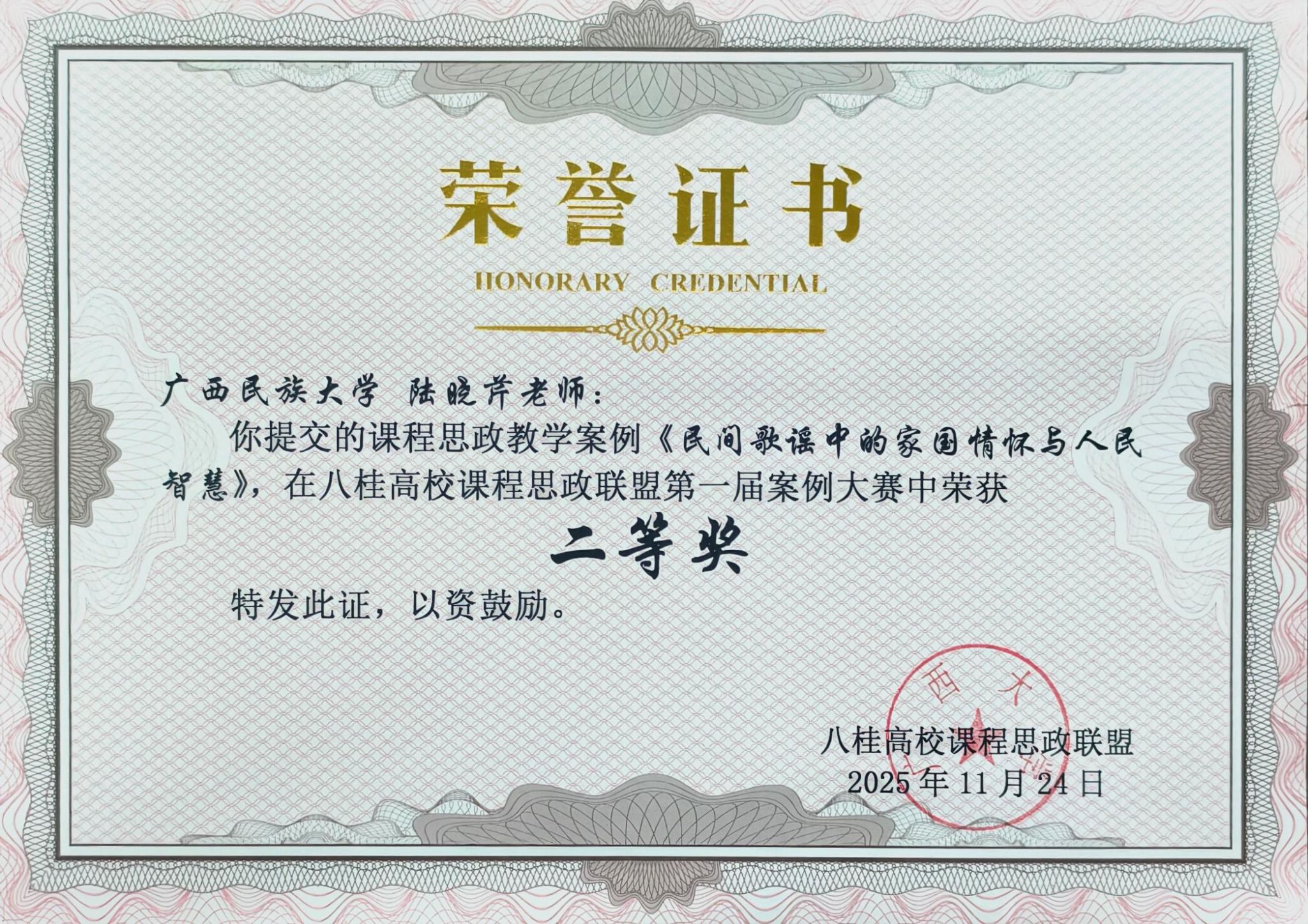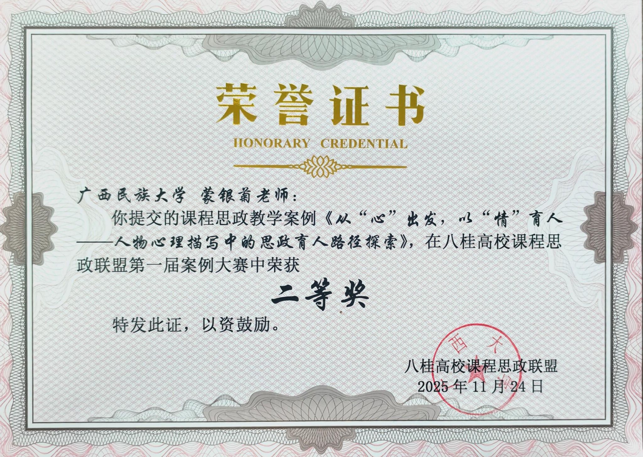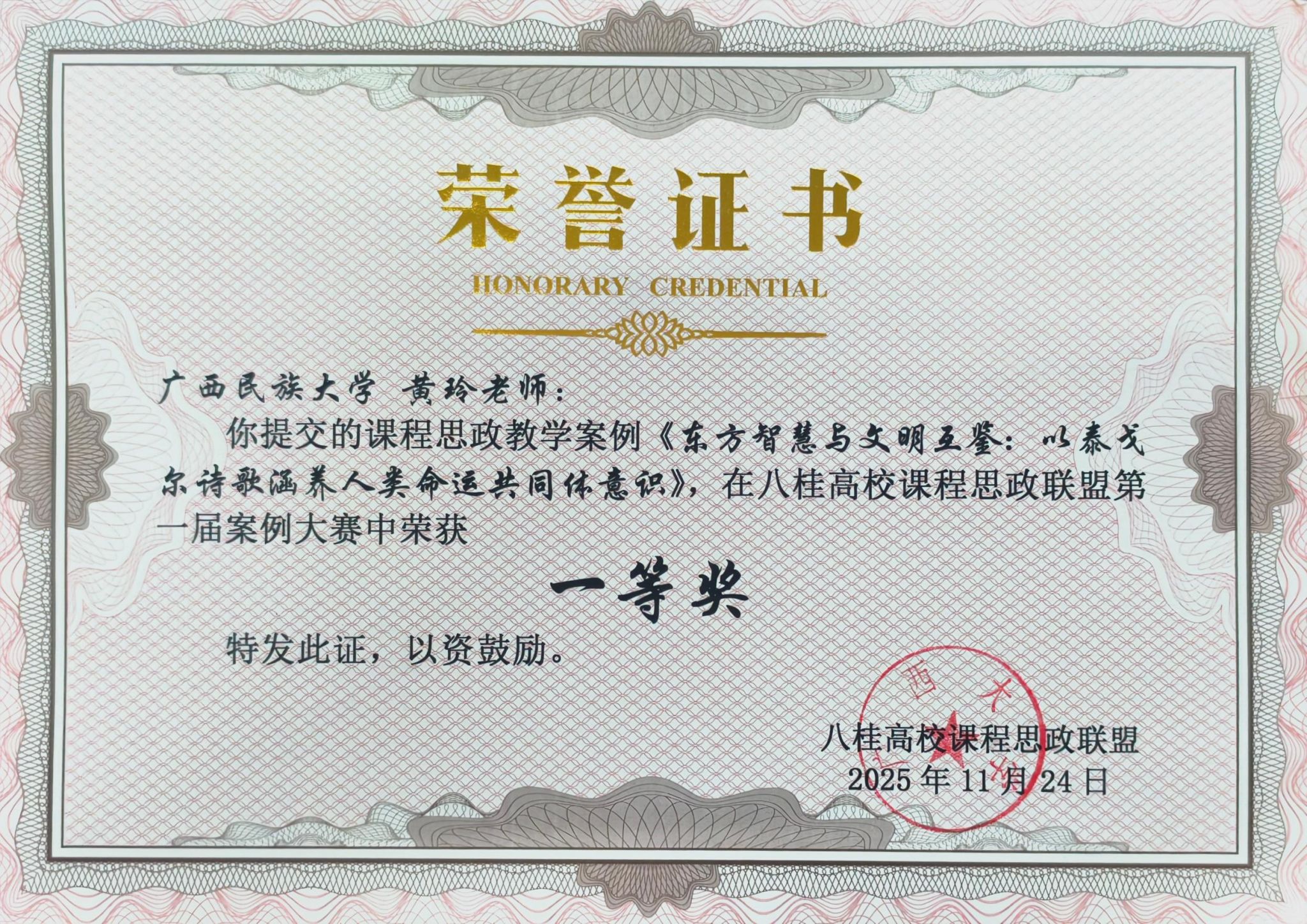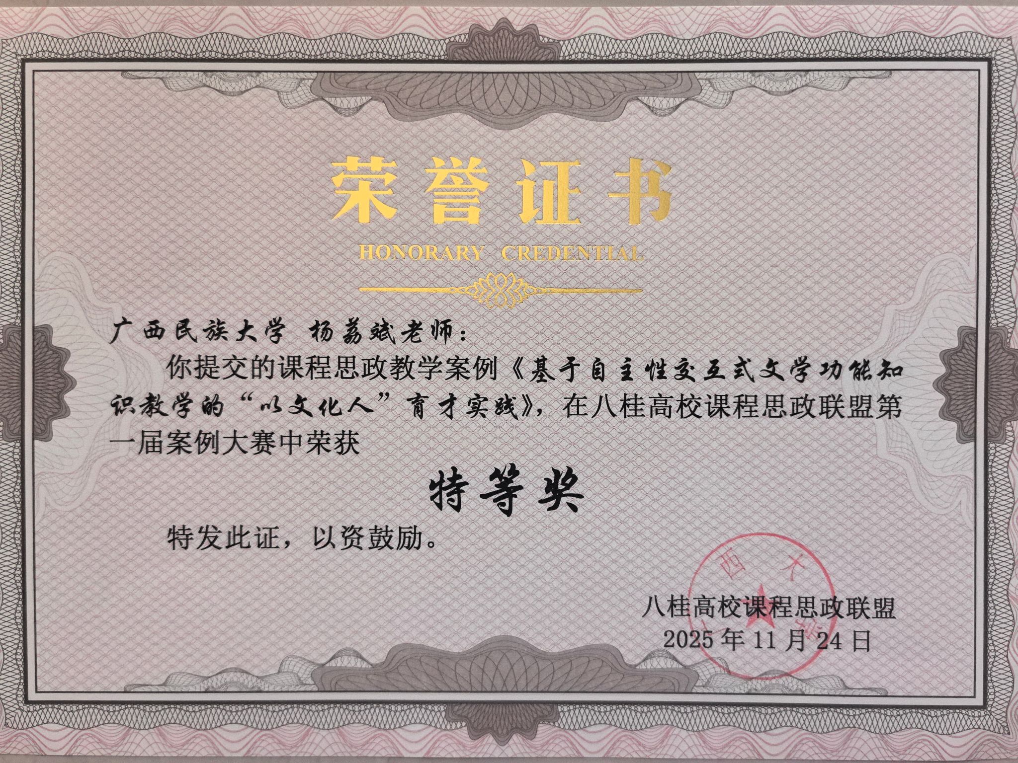 杨荔斌老师所撰写的案例《基于自主性交互式文学功能知识教学的“以文化人”育才实践》获特等奖,黄玲老师所撰写的案例《东方智慧与文明互鉴:以泰戈尔诗歌涵养人类命运共同体意识》获一等奖,陆晓芹老师撰写的《民间歌谣中的家国情怀与人民智慧》和蒙银菊老师撰写的《从“心”出发,以“情”育人——人物心理描写中的思政育人路径探索》获二等奖。必赢官网参赛教师团队立足教学实际,紧跟学术前沿,精准挖掘思政元素与专业教学的融合点,紧密结合文学教育的内涵与特点,覆盖文学功能知识教学、东方文学经典阐释、民间文学价值挖掘等多个维度,体现思政教育与专业教学的有机融合,以鲜明的育人导向、创新的设计思路和扎实的教学能力获得评审团的认可。