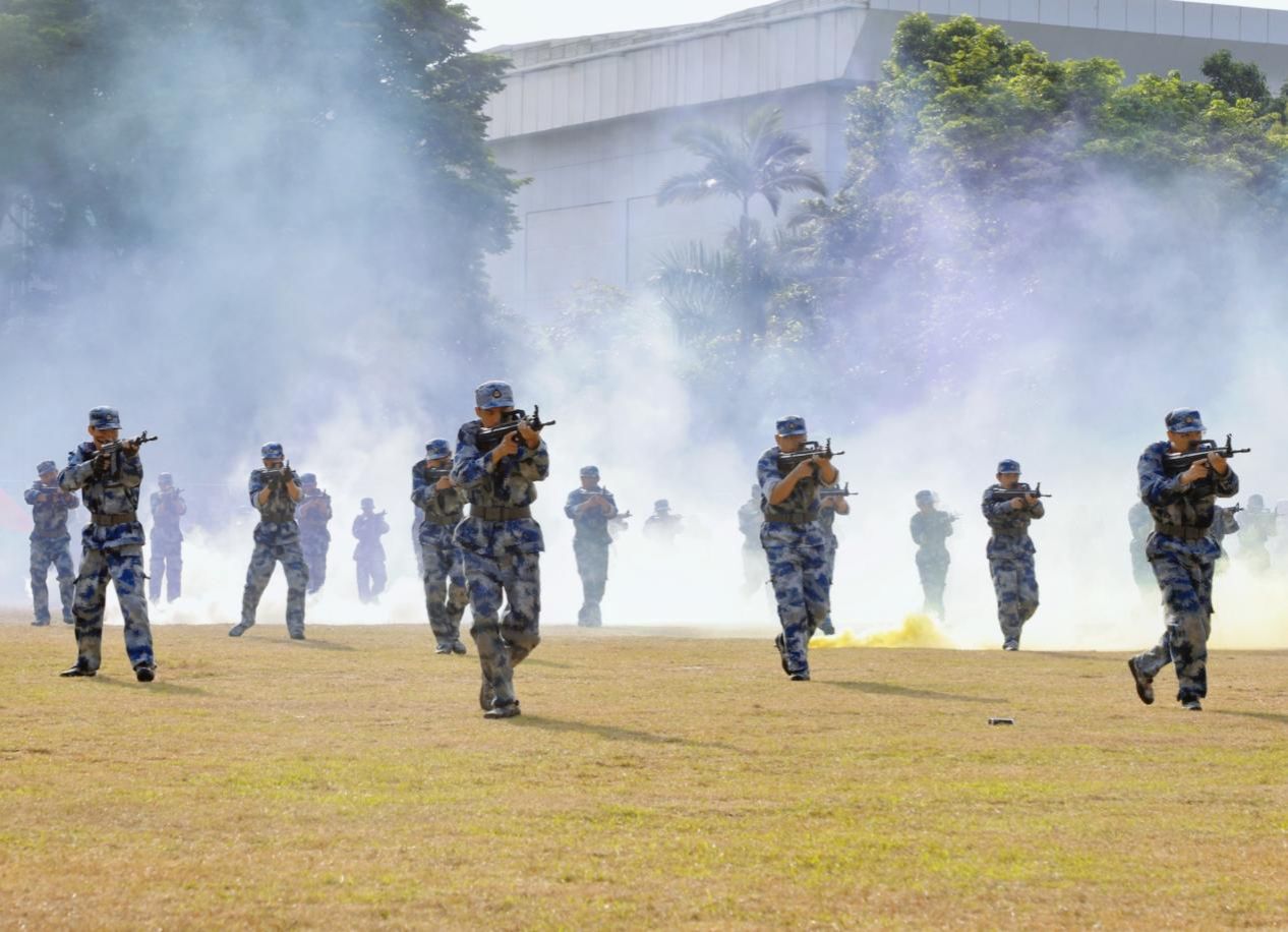 21日上午,相思湖校区军训汇演在国歌声中开始。分列式方队步伐整齐、口号响亮,正步通过主席台。军体拳与匕首操表演刚劲有力、动作整齐,引发掌声。战术演练中,队员持枪完成匍匐、突击等动作,队形流畅,目光坚毅。防恐演习引入机器狗协同作战,行动迅猛,精准执行腾跃与行进任务,展现人机协同和科技强军理念。本次汇演全面展示新生经军训所锤炼的意志品质与国防素养,凸显军事训练与科技融合的育人成效。