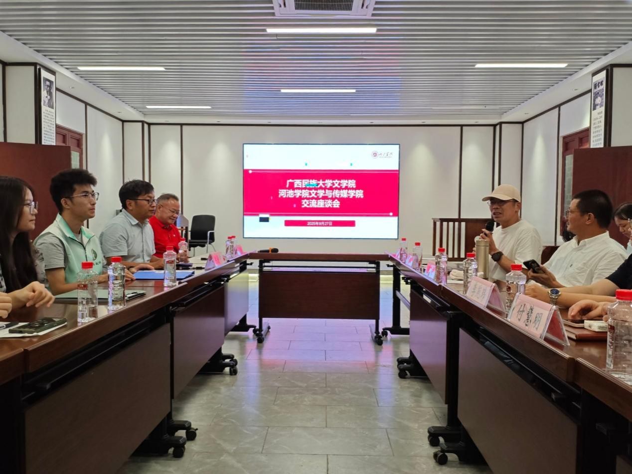当晚,研学团队前往河池学院开展交流。河池学院文学与传媒学院党委书记欧阳珍与黄土路教授、成立教授等老师带领师生参观了校内设立的凡一平、东西文学馆。随后,两院师生围绕地域文学创作、写作教学实践等议题展开座谈。通过本次学习交流,同学们在跨校对话中拓宽了文学视野,也增强了对不同院校学术氛围的理解。