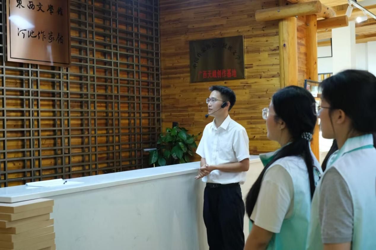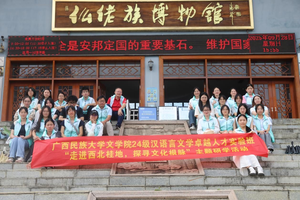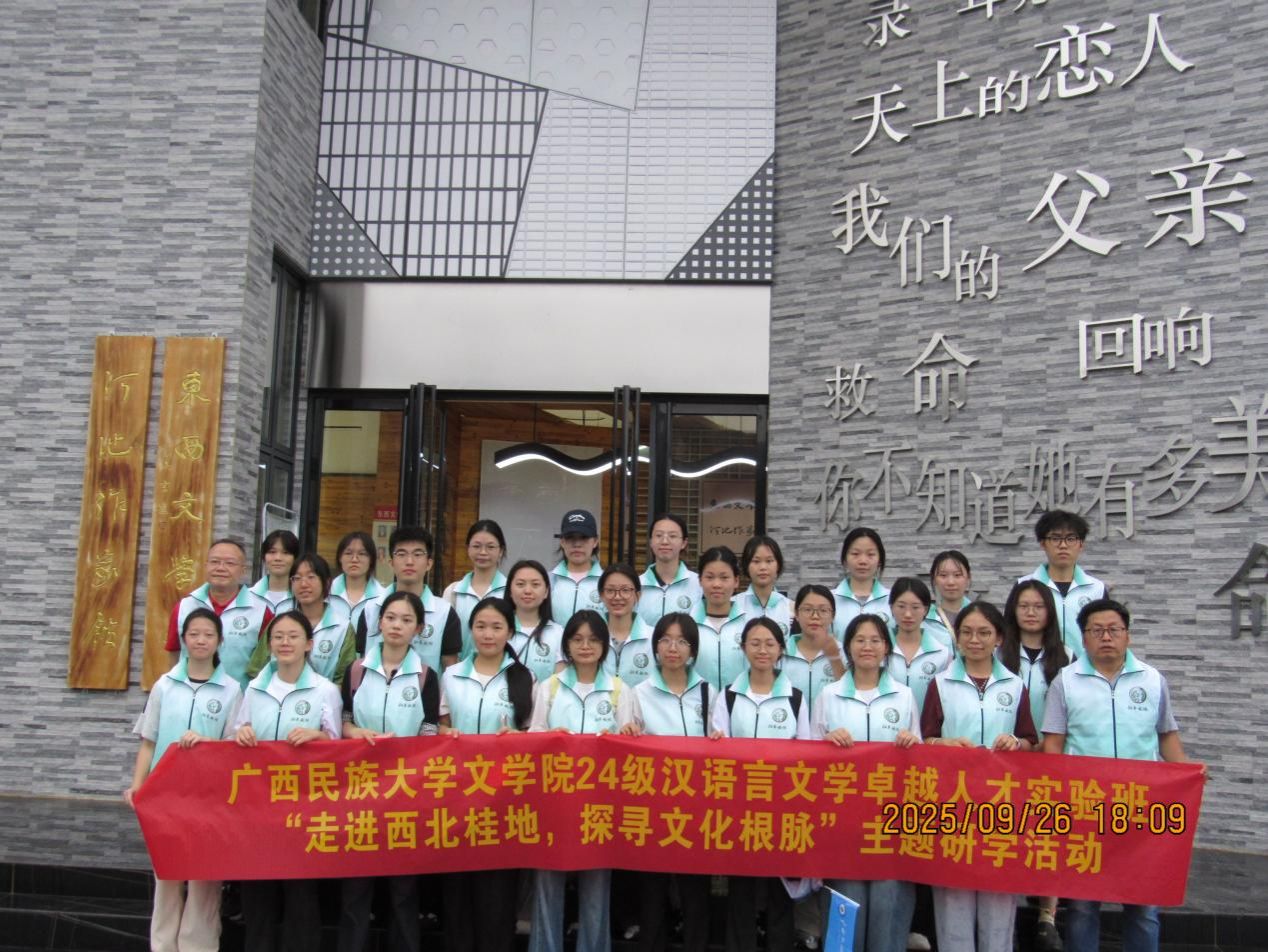 为深化必赢官网学生对桂西北地域文化与文学创作现场的理解,9月26-29日,2024级汉语言文学卓越人才实验班28名同学在学院党委副书记吴先源与陈爱中教授的带领下,赴河池市开展为期4天的“走进西北桂地,探寻文化根脉”研学活动。活动以文学寻踪、民俗体验与跨校交流为主线,系统走访河池三县,构建起一堂“行走的文学课”。