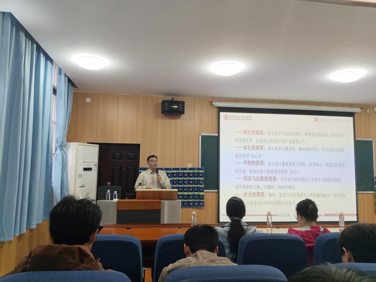 唐秋生校长深入阐释“卓越”的内涵,指出卓越语文教师需超越“经师”成为“人师”,并以“卓越=扎实的基本功+积极的工作态度+持续的发展力”的公式,明确卓越语文教师是“匠人”“学者”与“诗人”三重角色的统一。他结合自身经验与当下教育现状,从“坚守初心,满怀希望”“初出茅庐,站稳讲台”“千锤百炼,成就卓越”“担当使命,名师标配”“把握机会,竞争上岗”五个维度,构建立体卓越教师三维模型基础,系统梳理卓越语文教师的成长路径和素养追求,为在场师范生指明专业发展的方向。