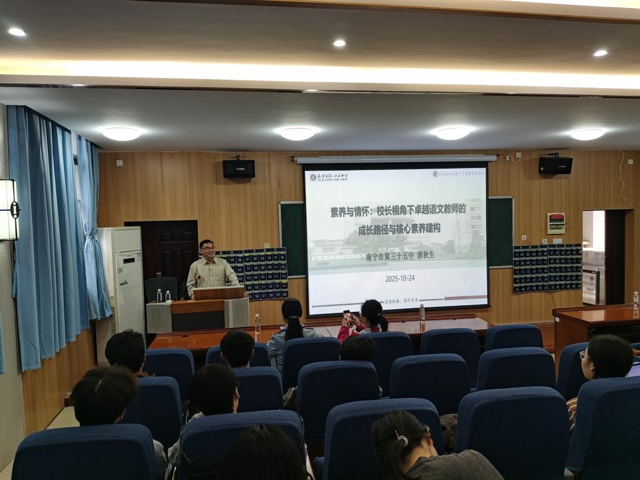 10月24日下午,73882必赢最新官网在博文楼一教一梯举行“素养与情怀:校长视角下卓越语文教师的专业成长路径与核心素养建构”专题讲座。讲座由南宁市第三十五中学校长唐秋生主讲,2023级汉语言文学师范班全体学生参加讲座。李燕玲老师主持,黄玲副院长、语文教研室赵筠老师出席。