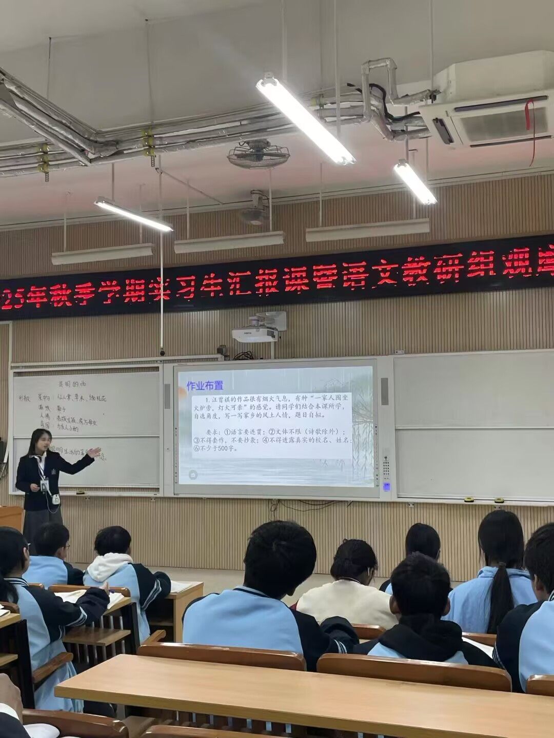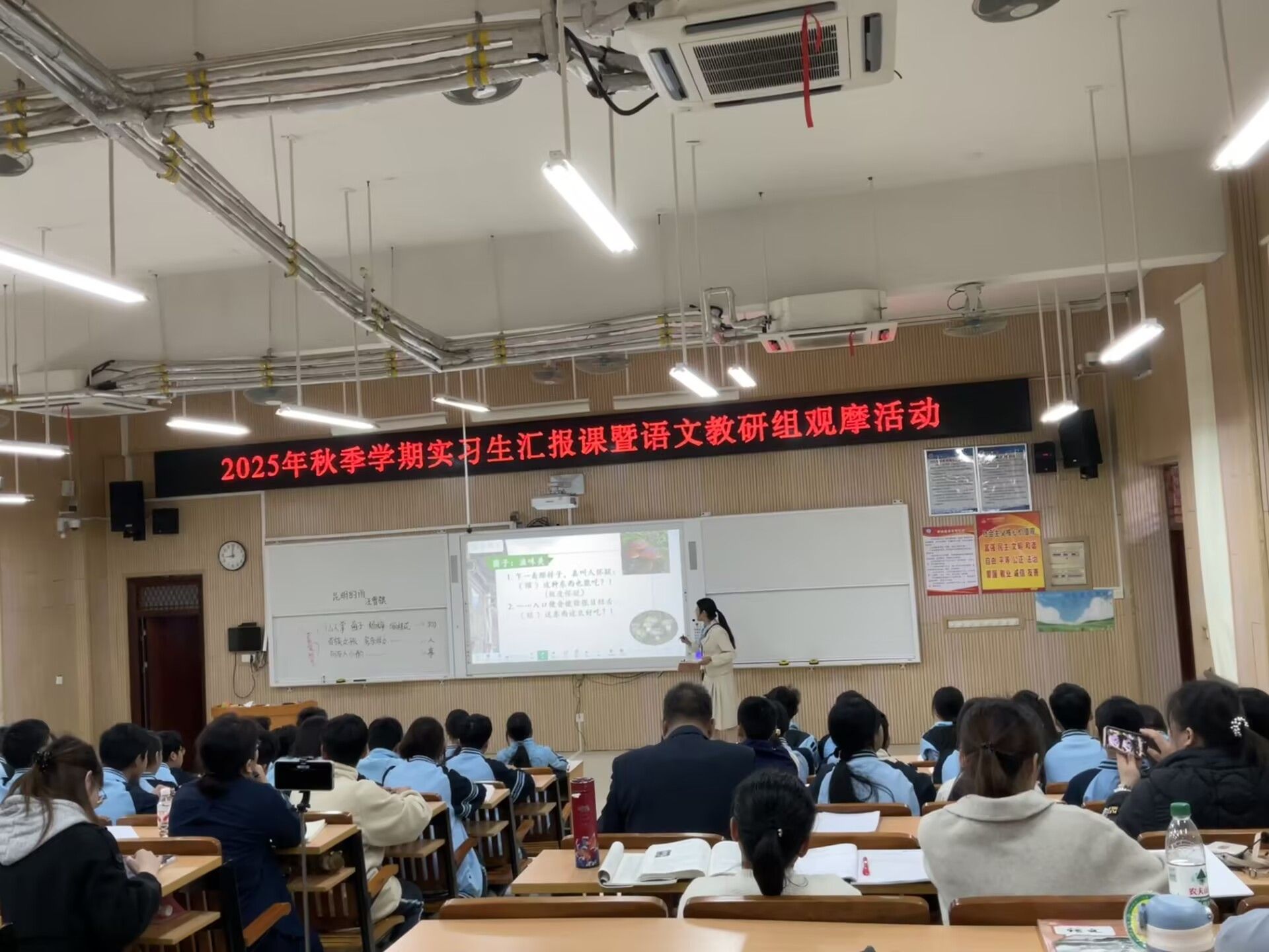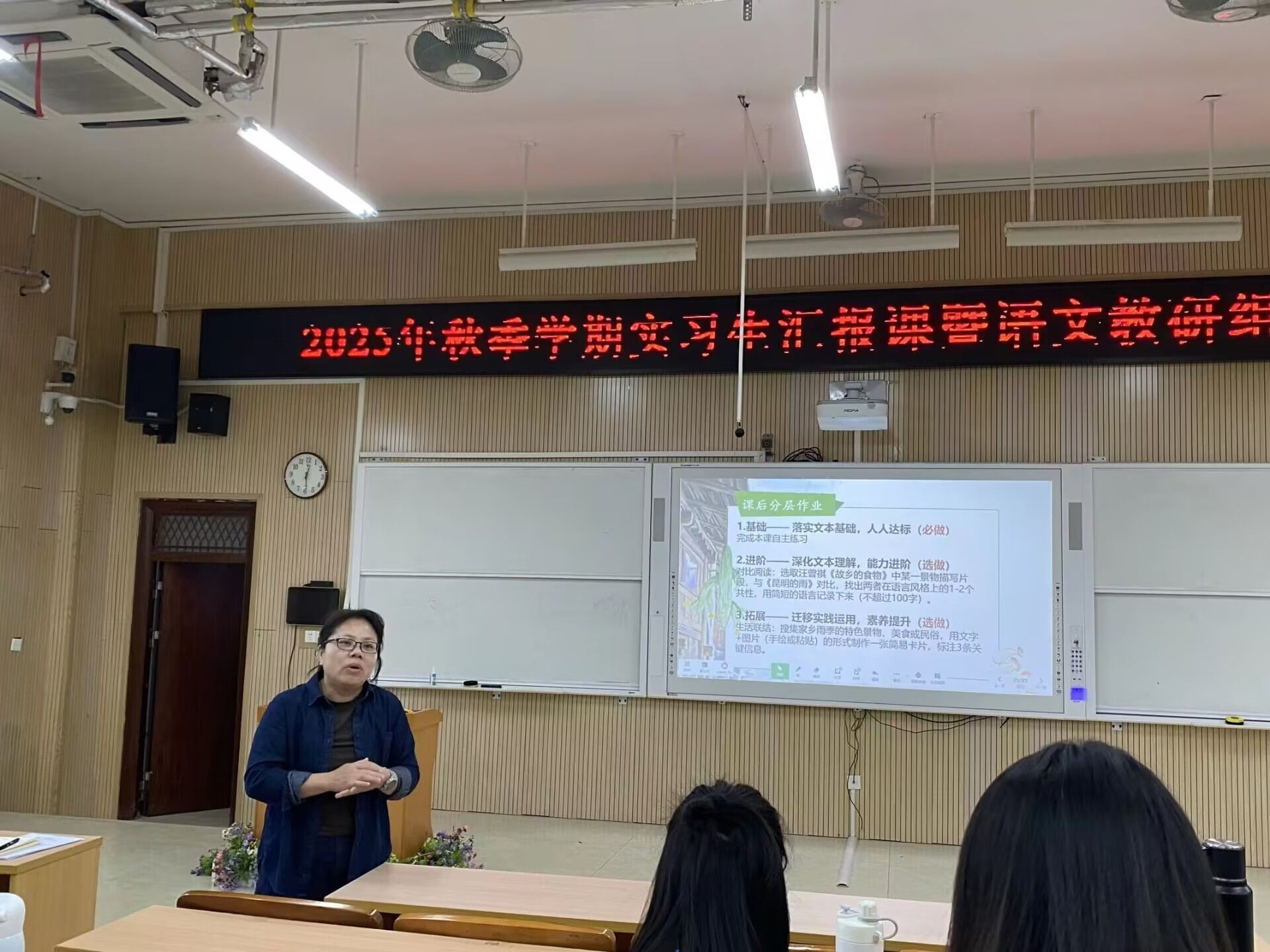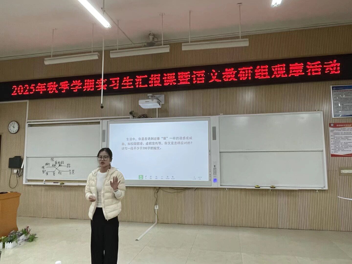 本次汇报课采用“同课异构 形式,七年级文言文篇目《狼》的授课任务由22级汉语言文学师范2班陈璇、黄霞两位实习老师共同完成。八年级汇报课聚焦散文名篇《昆明的雨》,由22级汉语言文学师范1班陈佳华、莫滢潞两位实习老师接力授课。