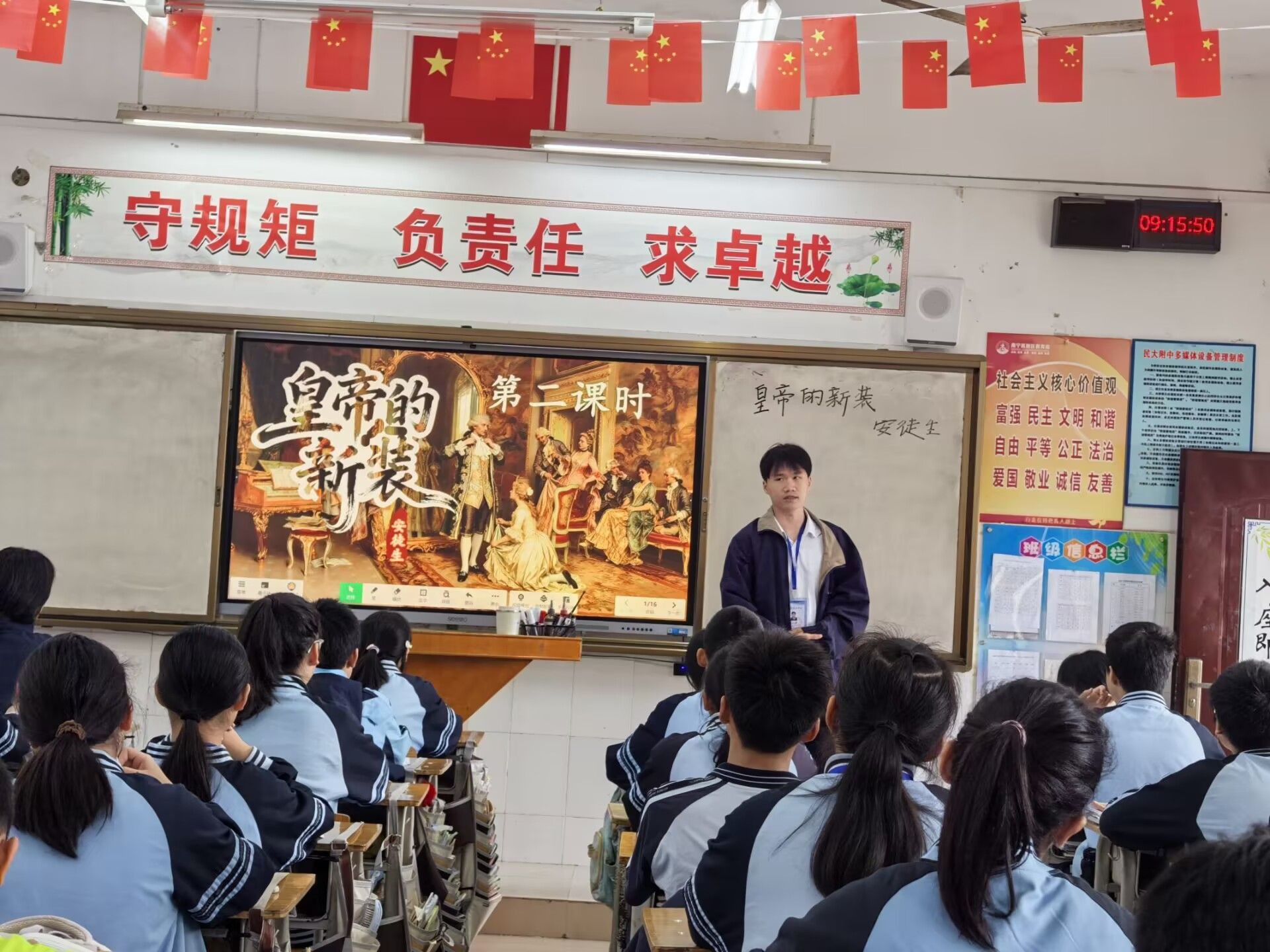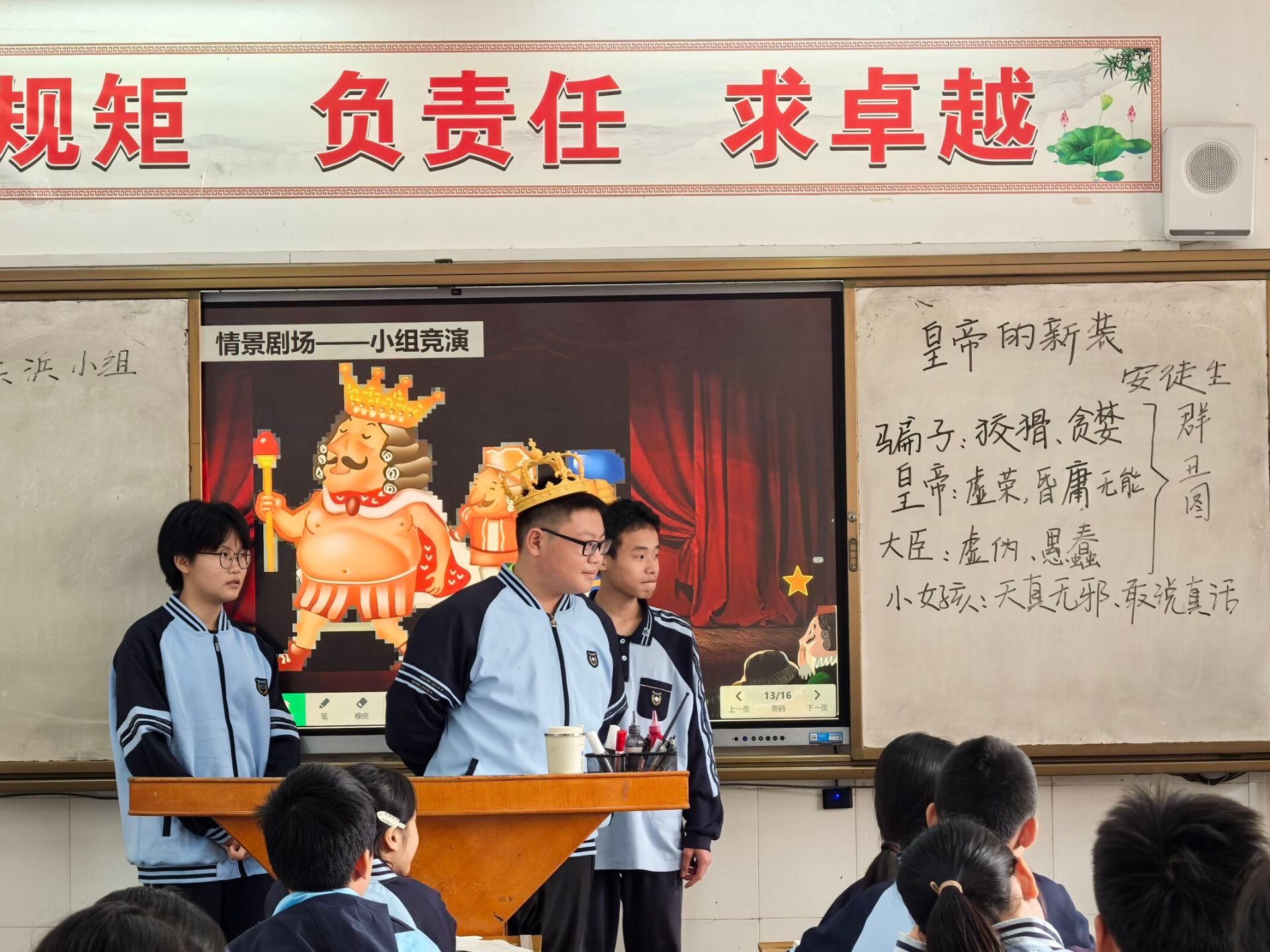 在实习生汇报环节,来自2022级汉语言文学师范1班的李尚东同学执教《皇帝的新装》一课,紧扣七年级学生的学习情况和认知特点,精心设计教学内容,引导学生深入分析写作手法及这一童话故事的现实意义。课堂上还别出心裁地设计情景剧环节,由两组学生进行情景剧表演,生动再现故事情节。该环节收获了在师生的一致好评。整节课学生热情高涨,踊跃参与,课堂氛围活跃。