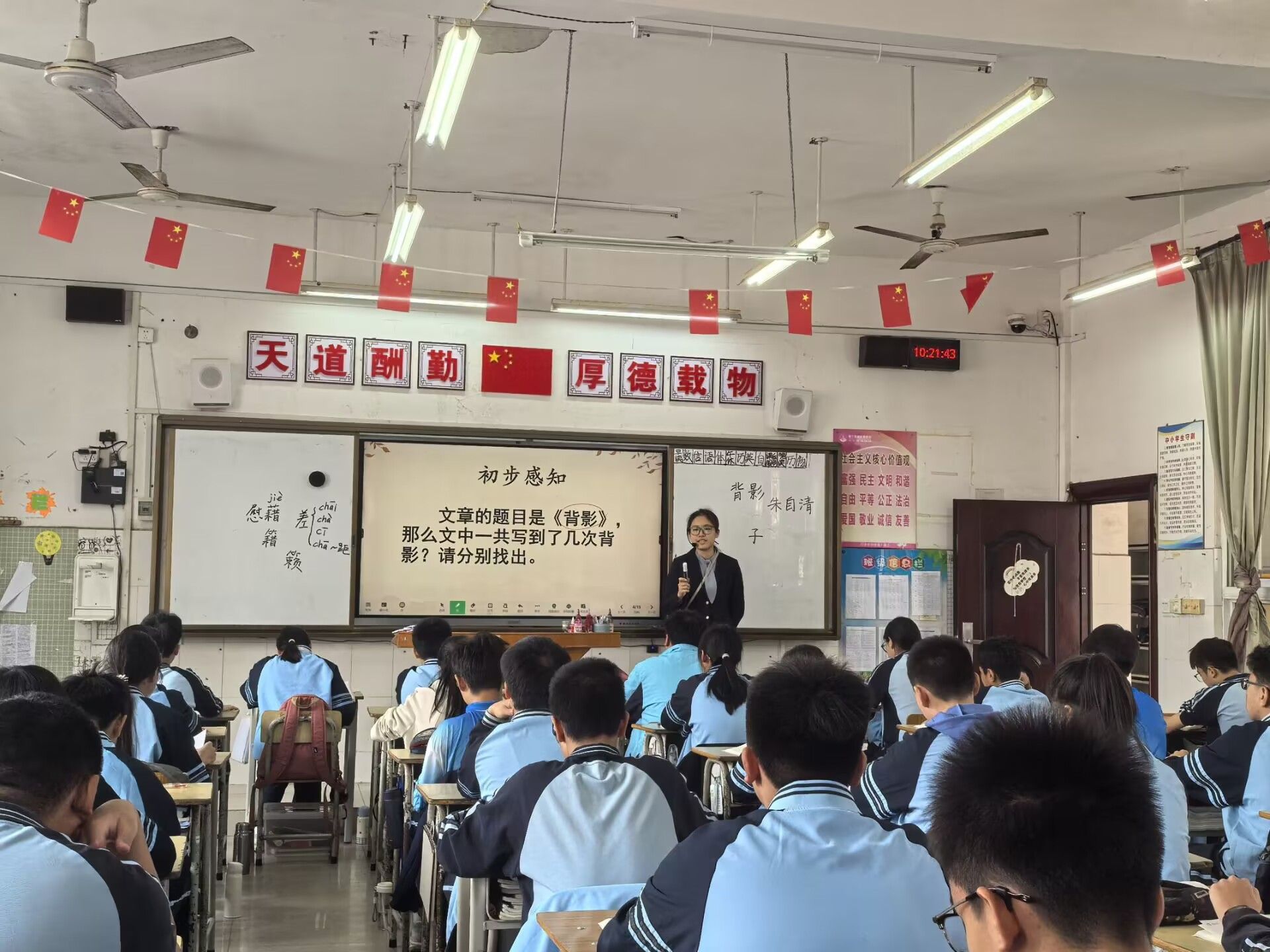 来自2022级汉语言文学师范2班的连龙玲同学则通过歌曲《父亲》创设情境,自然而然地引入《背影》这一篇课文。在授课过程中,连龙玲老师注重基础知识的落实,耐心讲解易错字,多音字等基础知识。以“背影”为主线,引导学生分析人物描写手法和思想情感。课堂尾声,连龙玲同学鼓励学生分享“我与父亲之间的故事”,将亲情教育融入感悟中,体现立德树人,润物无声的教育理念。