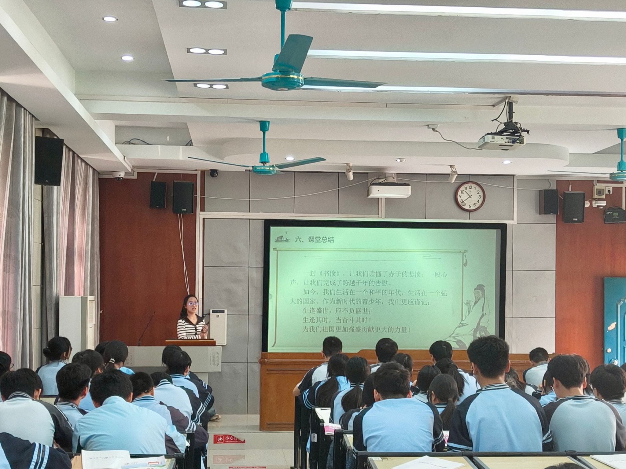 实习老师黎霄以“穿越时空的来信”为创意导入,迅速点燃学生兴趣。随后引导学生反复诵读诗歌、解读标题深意,通过文本细读与南宋历史背景补充,层层深入剖析陆游“报国无门、壮志难酬、年华空老、无人领军”的四重愤懑,溯源南宋主和派阻挠收复失地的时代根源。最后,黎老师以古今对话形式收尾,鼓励学生提笔给陆游写回信,在告慰先贤的文字表达中深化爱国认知,巧妙实现读写结合的教学目标。