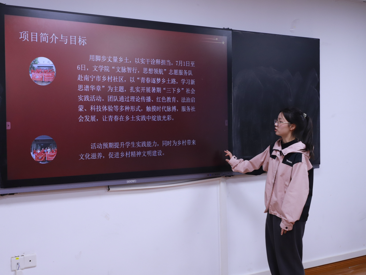 覃诗婷从弘扬革命精神、法治宣传、实地调研与理论问答四个板块汇报“文脉智行,思想领航”志愿服务队的实践活动情况。覃一涵与许馨月分别以南宁中关村和邓颖超纪念馆为例,阐述科技与文化融合发展的现实路径。花一方介绍团队在忠良村的考察见闻,认为忠良村“忠诚”文化的创造性转化对乡村振兴具有借鉴意义。