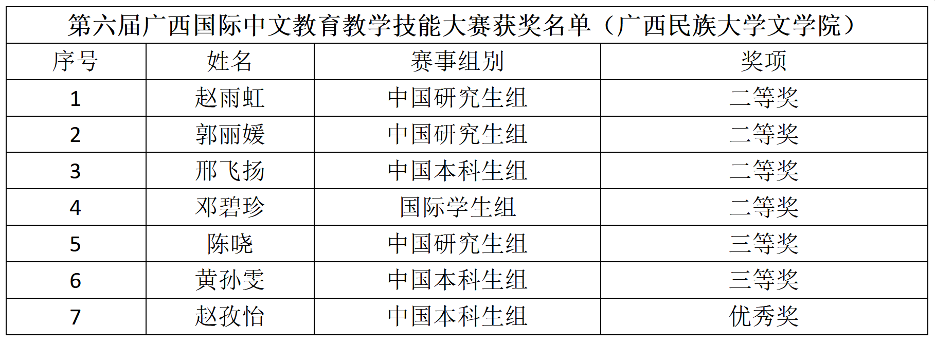 12月6日至7日,第六届广西高校国际中文教育教学技能大赛于梧州学院举行。必赢官网派出7名选手参赛,凭借扎实的专业素养与出色的教学能力斩获佳绩,最终荣获二等奖四项,三等奖两项,优秀奖一项,共七项区级奖项。