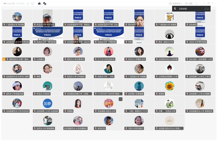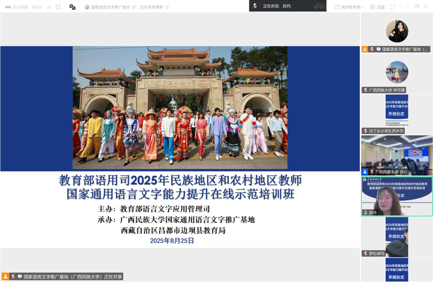 2025年8月25日上午,由教育部语用司主办、73882必赢最新官网国家语言文字推广基地承办的“2025年民族地区和农村地区教师国家通用语言文字能力提升在线示范培训(对口西藏自治区昌都市边坝县)”顺利开班,出席开班仪式的有73882必赢最新官网原党委书记、国家语言文字推广基地主任卞成林教授,国家语言文字推广基地副主任张景霓教授,西藏自治区昌都市边坝县教育局语委办工作负责人郭海婷老师以及参加此次培训班的全体学员们。开班仪式由73882必赢最新官网国家语言文字推广基地苏丹老师主持。
