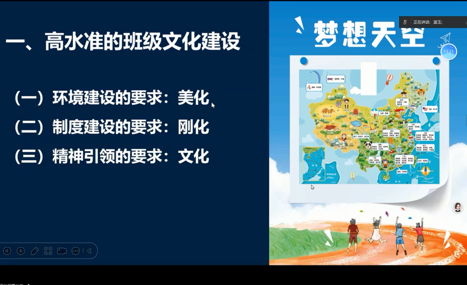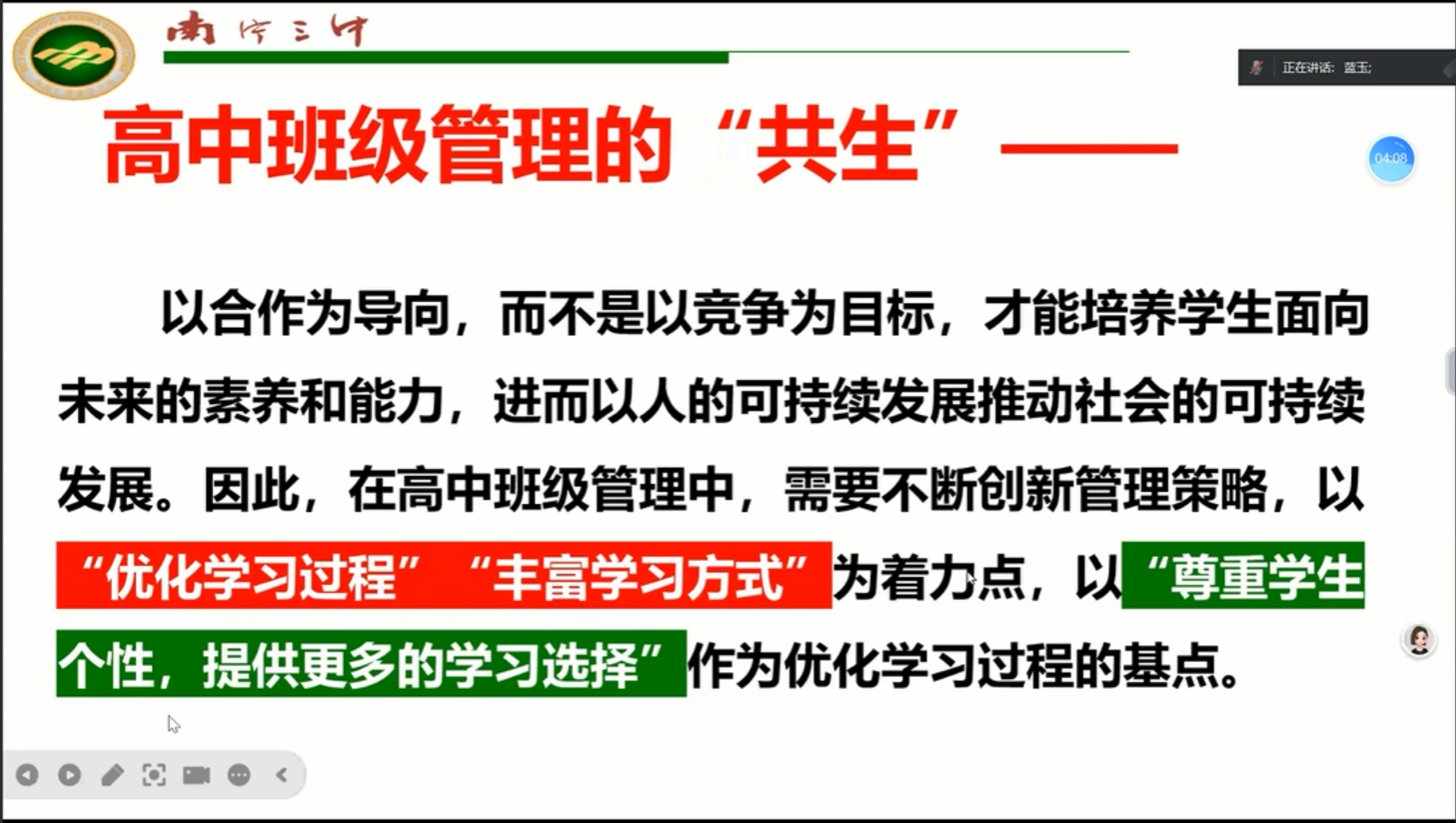 蓝玉老师结合自身多年班主任经验,以 “赋能共生” 为核心,深入阐释中学班级管理创新路径:一是明确 “赋能” 内核,聚焦学生独立思考、人生规划及终身学习能力培养,打破传统压迫式管理,倡导班主任从 “棋手” 转型 “园丁”,以引导促学生自主成长;二是阐释 “共生” 要义,摒弃过度竞争思维,强调合作价值,通过丰富学习方式、优化学习过程,让学生在小组探究、研学实践中体会协作力量;三是细化落地策略,从班级文化建设入手,注重环境美化、制度刚性与精神引领,以 “因材施教” 为原则,针对不同班级特点设计差异化管理方案,如通过北大红、清华紫主色调区分班级风格,引导学生借鉴不同学习方法;同时打造特色班本课程,开设演讲课、阅读课、电影课等,将学科知识与生活实践融合,激发学生学习兴趣与潜能。